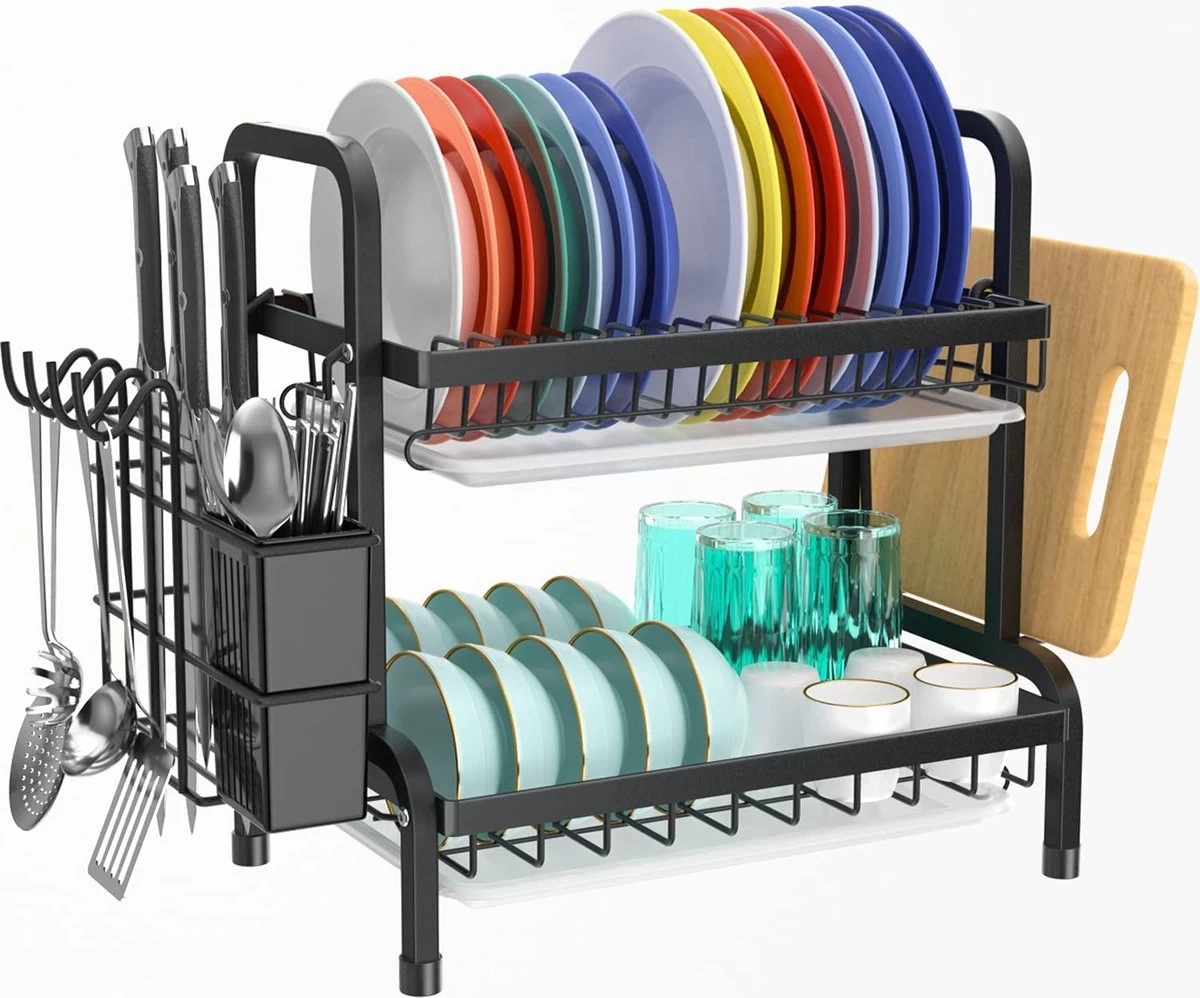 - Multifunctioneel ontwerp: de vaatzeef bestaat uit drie delen, de middelste 2 lagen schotelrek kan alle items plaatsen die je nodig hebt. De ene kant is een snijplankhouder, een andere kant is gereedschapshouders en messenrek, 4 extra haken kunnen je vodden, spatels, soeppollepels vasthouden, sterk voldoen aan je behoeften