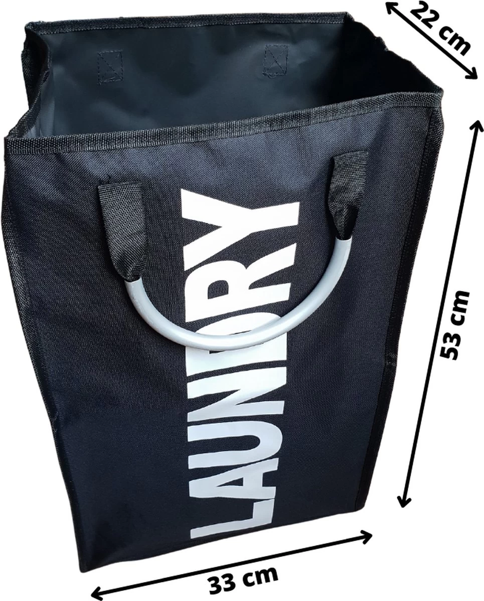 De wasmand is 33 cm breed en 22 cm lang en is 53 cm hoog. als de wasmand vol is kan het wat breder uitvallen.