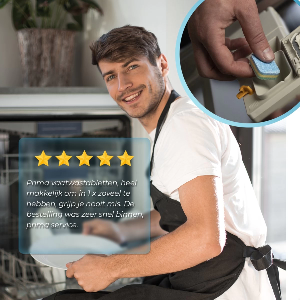 - Effectieve all-in-one formule (3-laags tablet): reiniging, ontkalking en glans in één