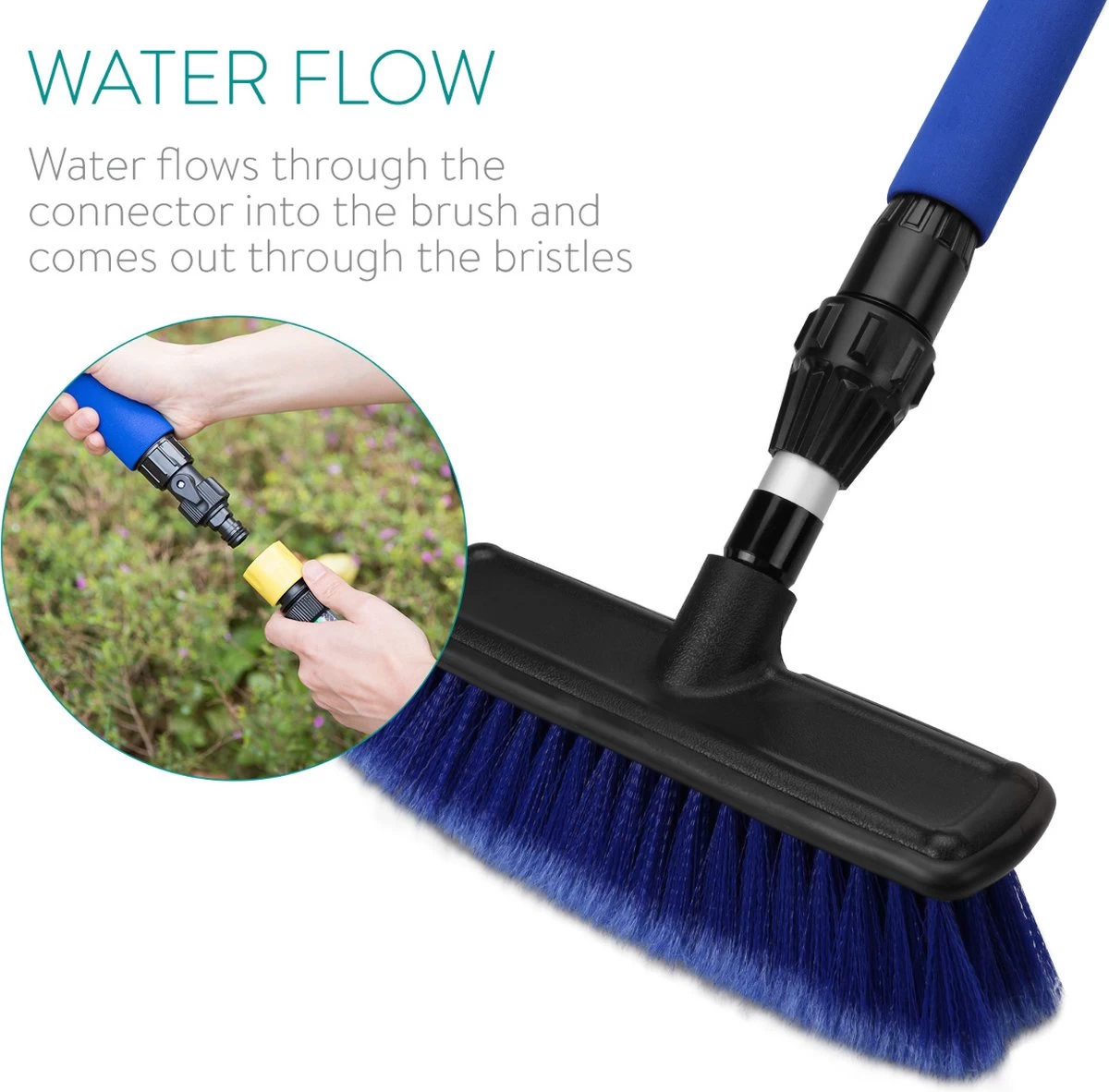 - GEBRUIKSAANWIJZING: Met het verbindstuk sluit je de borstel snel aan op de tuinslang. Je kunt de hoeveelheid water die door de wasborstel stroomt aanpassen door het verbindstuk met de klok mee of tegen de klok in te draaien.