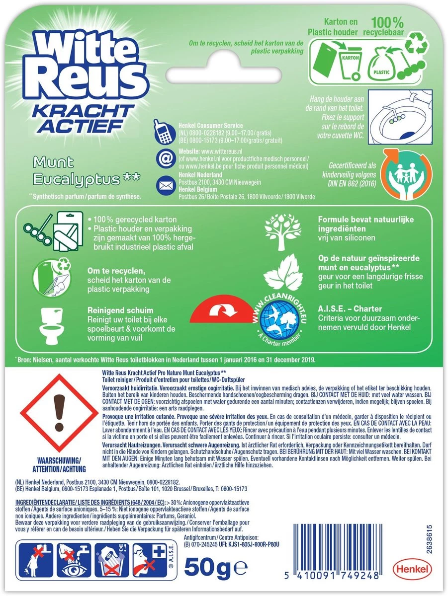 Witte Reus Kracht Actief Pro Nature Munt Eucalyptus wcblok zorgt voor een schoon en fris toilet door middel van natuurlijke ingrediënten. Het is een duurzame en handige manier om te zorgen voor een schoon toilet van de eerste tot de laatste spoelbeurt.